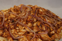 Now grab your favorite BBQ sauce and pour a liberal amount to mix with the chicken. This is your pizza sauce base. I mix it so that all the chicken really gets good and BBQ'd! This step helps especially when you are using leftovers. Next just spread the BBQ filling across your naan crust, top with onions and mozzarella cheese. You may notice I'm not giving you exact amounts, as this recipe is so easy you just don't need them. Have fun playing with your food.